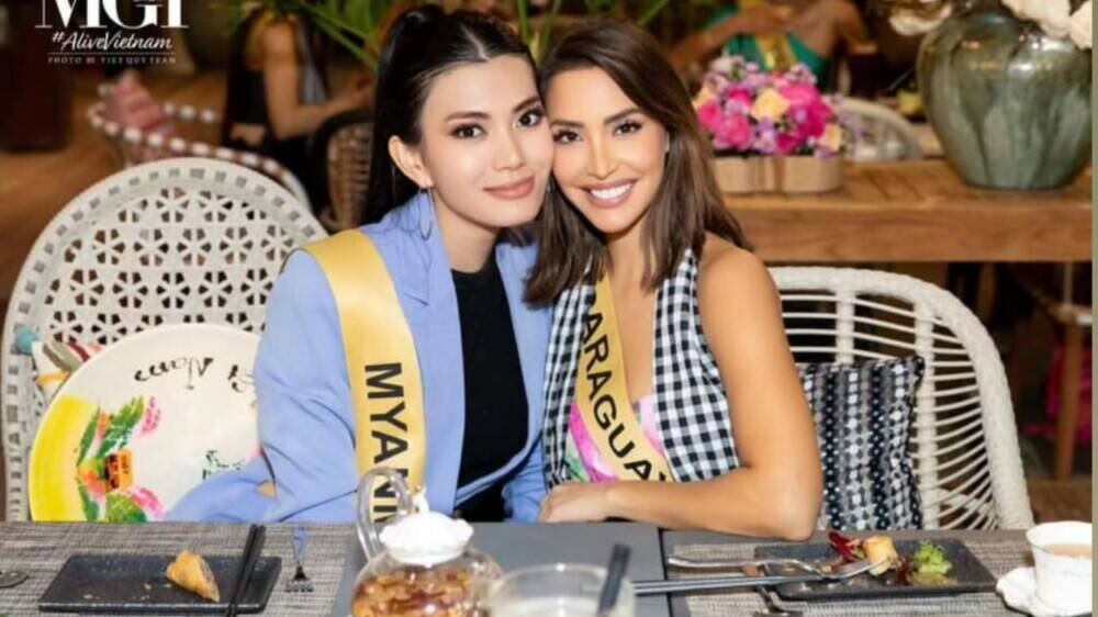 En un momento dado, la Miss Birmania de nombre Ni Ni Lin, amagó con darle un piquito a nuestra compatriota, pero terminó dándole el beso en la mejilla.