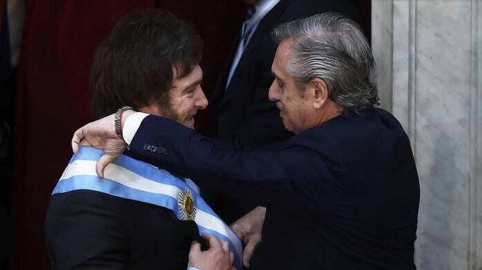 Luego el presi saliente Alberto Fernández le colocó la banda y le cedió el bastón, los atributos presidenciales, a su sucesor.