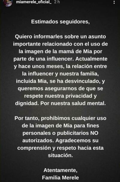 “Estimados seguidores, quiero informarles sobre un asunto importante relacionado con el uso de la mamá de Mía por parte de una influencer. Actualmente y hace unos meses, la relación entre la influencer y nuestra familia, incluida Mía, se ha desvinculado, y queremos asegurarnos de que se respete nuestra privacidad y dignidad. Por nuestra salud mental”, dice parte del comunicado.