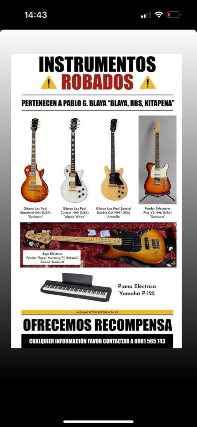El músico estaba ofreciendo recompensa para poder recuperar sus instrumentos que le fueron robados. Al parecer, la policía llegó a los ladrones gracias a que los objetos que llevaron del estudio ya estaban ofreciendo por Facebook.