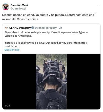 La periodista Carmiña Masi compartió a través de su cuenta X que tenía muchas ganas de hacer el curso y convertirse en agente especial, pero lamentó que no pueda porque un requisito le deja sin posibilidad.