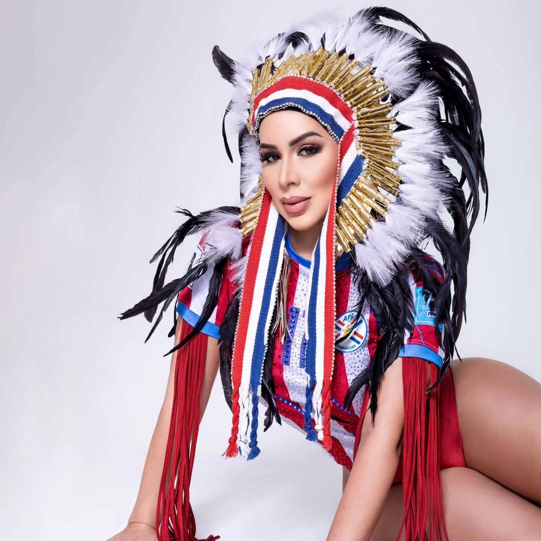 "Creando a la mujer paraguaya . Porque ser mujer es ser cultura. Raiz, historia y futuro del Paraguay. Orgullosa de decir, soy de raza guaraní", he'i la sexy esposa de Hernán Pérez con su albirroja puesta, complementando su look con un bikini rojo.